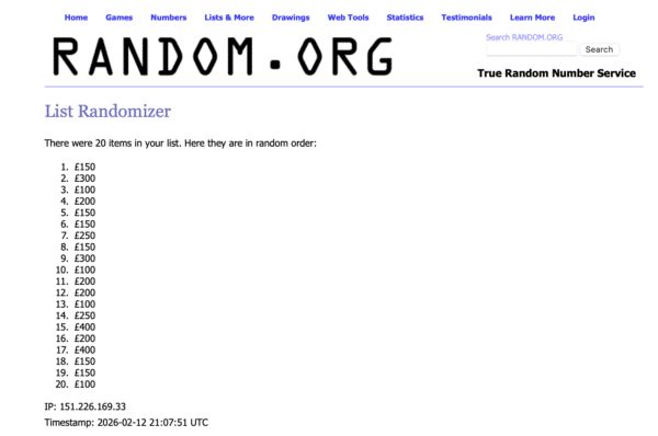 THE LIST HAS BEEN RANDOMISED USING RANDOM.ORG WITH A TIMESTAMP, SO YOU CAN BE CONFIDENT NOTHING WILL CHANGE.